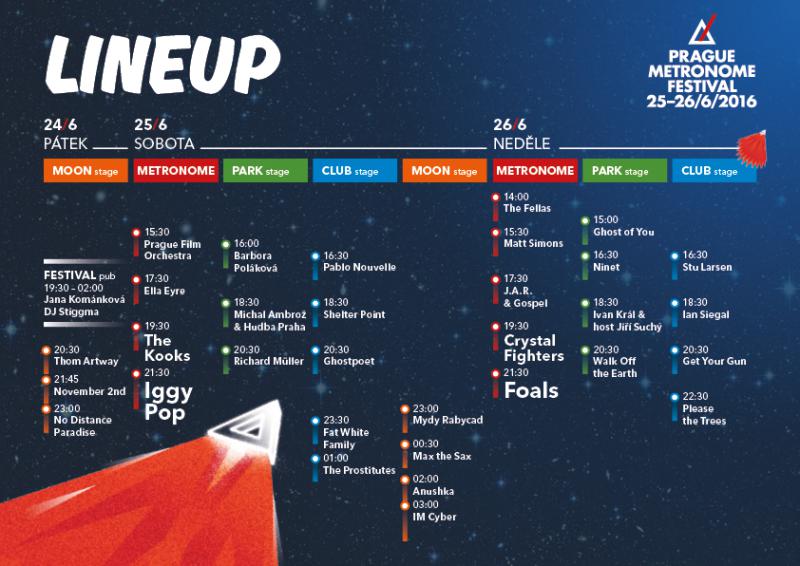 Nový dvoudenní hudební festival METRONOME, který proběhne 25. a 26. června v Praze, zveřejnil line-up s časy vystoupení jednotlivých interpretů! Už nyní si tak můžete naplánovat svůj festivalový program. Harmonogram připravili organizátoři tak, abyste stihli všechny koncerty, které vás zajímají! Již v pátek 24. června ve 20.30 ožije areál holešovického Výstaviště velkým hudebním večírkem. Během posledního červnového víkendu se pak na čtyřech pódiích v areálu holešovického Výstaviště představí na 30 zvučných jmen zahraniční i tuzemské hudební scény. V sobotu na hlavním pódiu vystoupí headliner festivalu legendární Iggy Pop, kapela The Kooks a elektro-popová zpěvačka Ella Eyre. Druhý festivalový den ovládnou svým úplně prvním pražským vystoupením Foals, elektrofolkaři Crystal Fighters a J.A.R. představí velkolepou show s gospelovým sborem. Mezi dalšími vystupujícími jsou například Walk Off The Earth, Ninet, Shelter Point, Matt Simons, Ghostpoet, Ian Siegal, Prostitutes či Please the Trees. Nenechte si ujít největší hudební víkend v Praze!