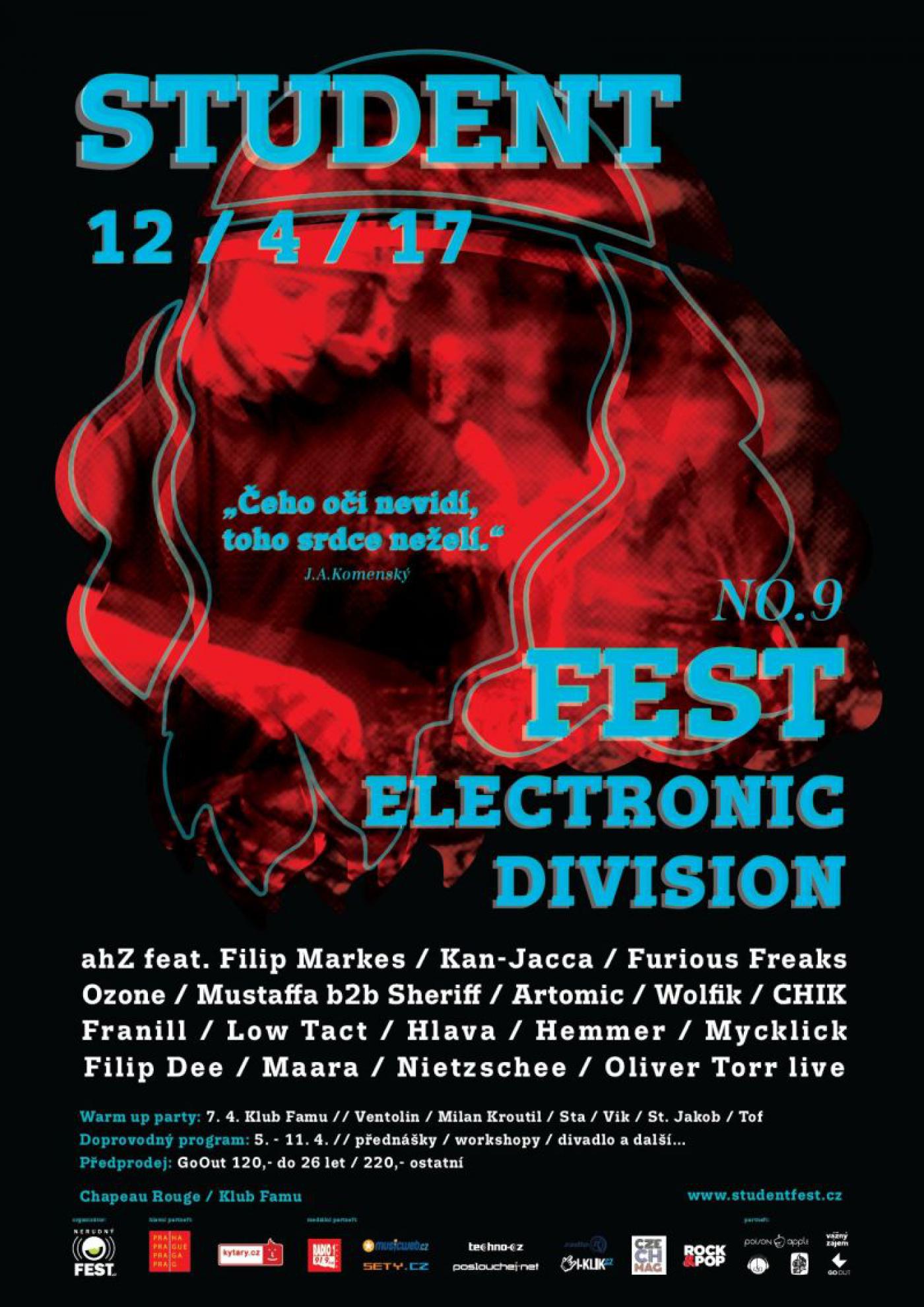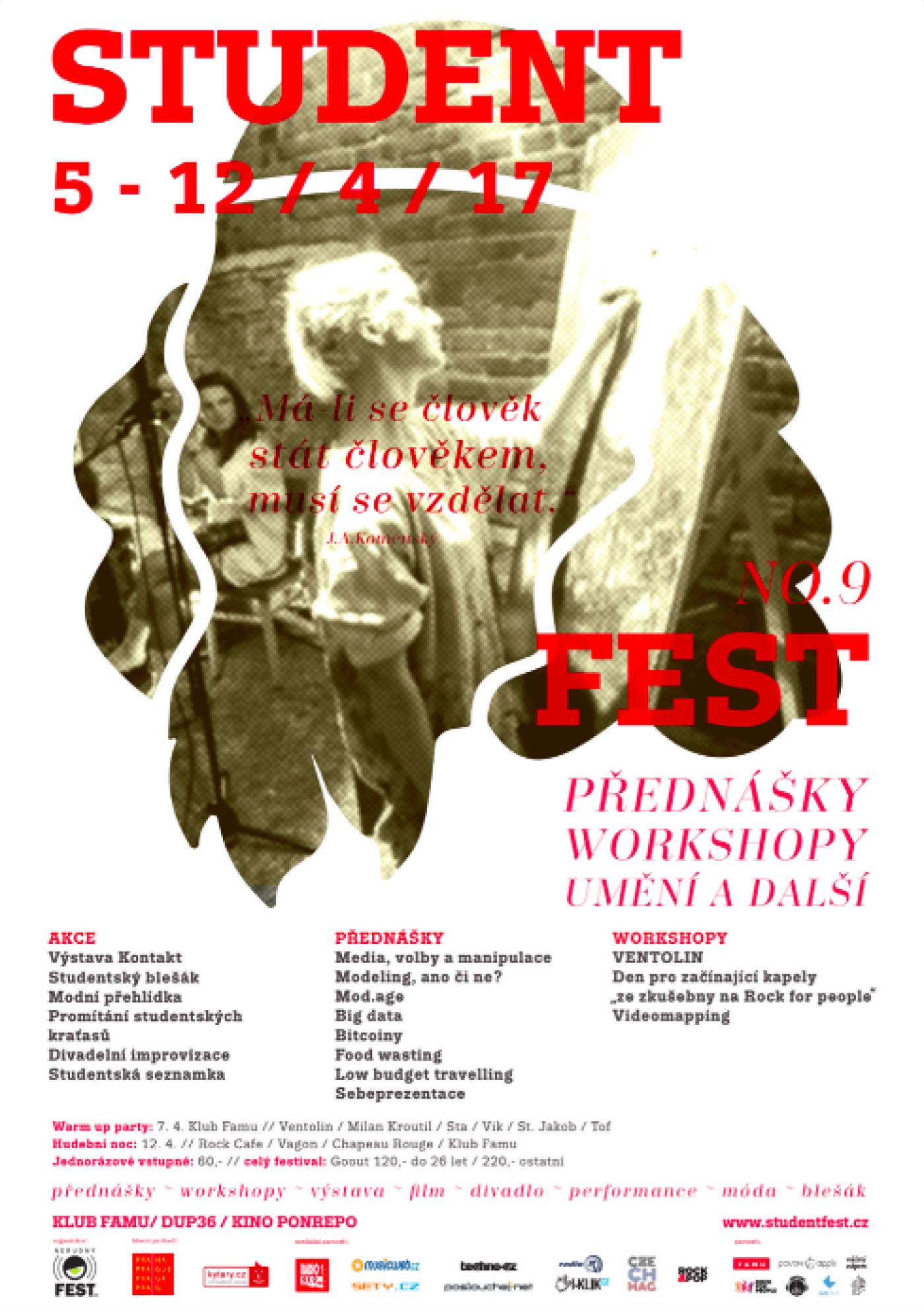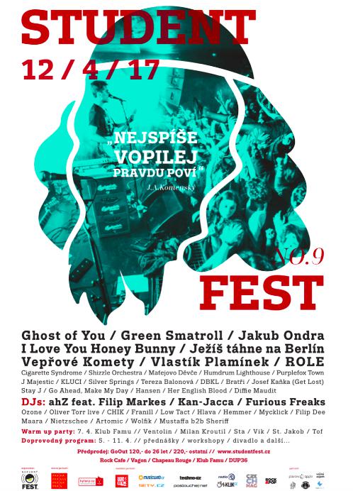 Svátek všech studentů je po roce opět tady a tentokrát s nejrozsáhlejším programem ve své historii. Největší český studentský festival představí v týdnu od 5. do 12. dubna nabitý program plný přednášek, workshopů, promítání, výstav, performancí a divadelních představení. Vše vyvrcholí již tradičním hudebním večerem ve středu 12. dubna ve čtyřech pražských klubech. Z jednodenní hudební akce se tak Student Fest stal týdenní multižánrovou přehlídkou, která spojuje amatérské a profesionální umělce z různých oborů. Snížené vstupné pro studenty do 26 let je k dostání v předprodeji GoOut za 120Kč a na místě za 150 Kč.