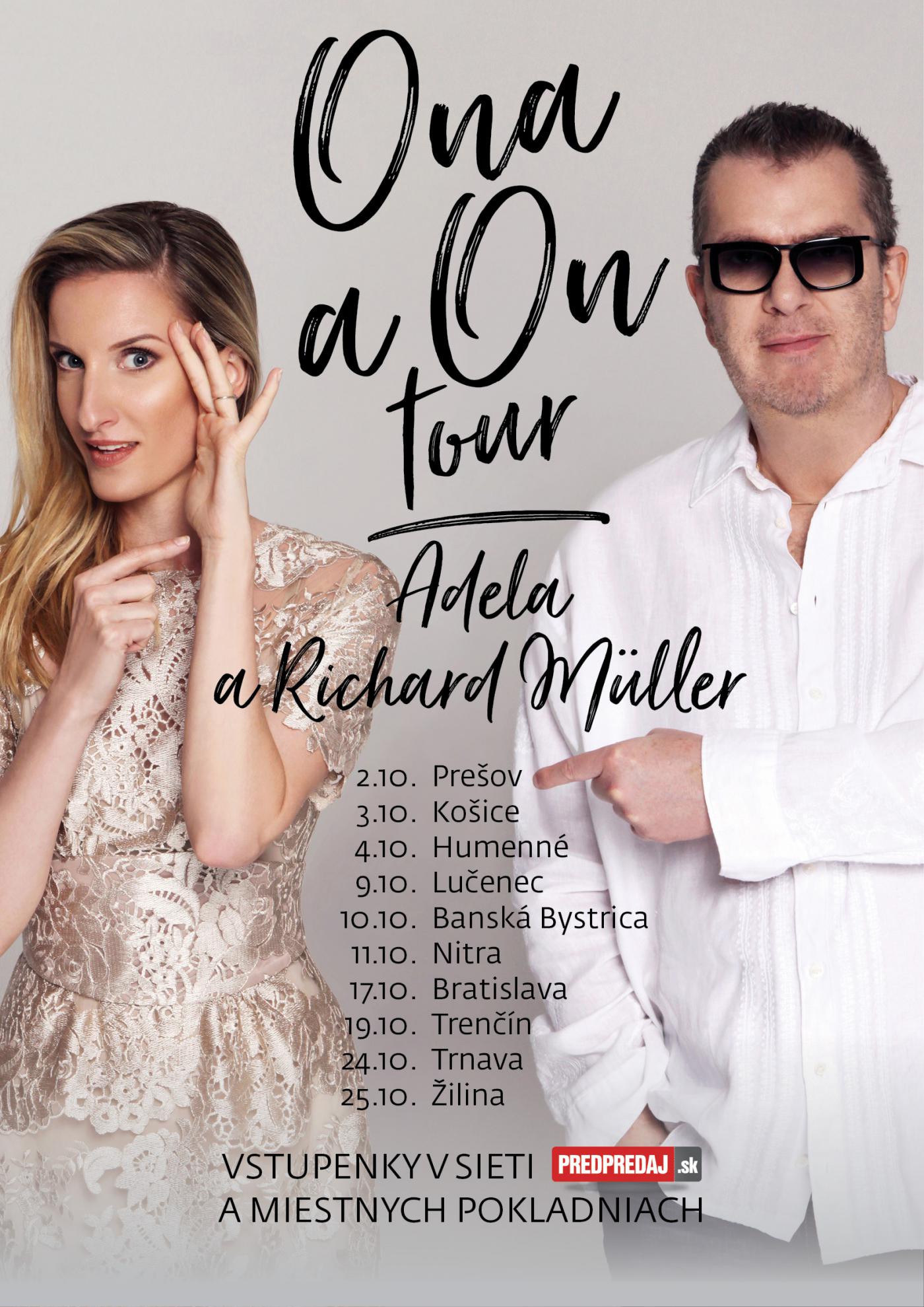 ONA a ON. To je spojenie dvoch výrazných a nezameniteľných osobností - speváka Richarda Müllera a moderátorky Adely Banášovej, ktorí vyrážajú na spoločné turné. Adela bude Richarda, ktorý je jej obdivovateľom, spovedať. A legendárny spevák sľubuje, že bude divákom bližšie ako kedykoľvek doteraz. Fanúšikovia tak môžu očakávať nielen nové informácie o hudobnej ikone, ale najmä bezprostredné komentáre a vtipné dialógy. Dominantou však aj tentoraz bude hudba. Richard Müller zaspieva svoje najväčšie hity v jedinečných interpretáciách a najmä skladby z nového albumu „55“. Nebude chýbať ani pieseň „Adieu Adele“, v ktorej sa Adela Banášová stala jeho múzou. Nenechajte si ujsť unikátne turné, aké tu ešte nebolo!