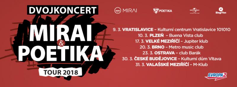 Vzhledem k tragické události v rodině člena kapely Mirai bylo společné turné se skupinou Poetika přesunuto na březen 2018. Nyní kapely oznámily náhradní termíny. Koncertní turné odstartuje 9. března v Kulturním centru Vratislavice 1010010. Kapely odehrají všech sedm slíbených koncertů a Tour 2018 zakončí 31. března v M-klubu ve Valašském Meziříčí. Vstupenky na všechna místa zůstávají v platnosti. Pražský koncert v Lucerna Music Baru zůstává v původním termínu 31. 10. 2017 a je poděkováním všem, kteří v této nelehké chvíli při kapele stojí. Zároveň obě skupiny v Lucerna Music Baru pokřtí svá debutová alba.