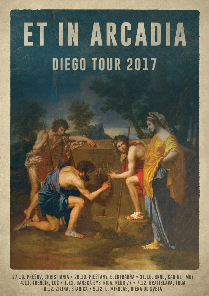 Turné Et In Arcadia Diego štartuje v piatok 27. októbra v prešovskej Christianii, pokračuje v novej piešťanskej Elektrárni, na budúci týždeň si Diego zahrá v Kabinete múz v Brne a v legendárnom trenčianskom klube Lúč. Čaká ju aj live vystúpenie v piatok 3. novembra ráno vo vysielaní Rádia_FM. „Diváci prvých koncertov budú ako prví počuť nové skladby, bude to ich koncertná premiéra a myslíme si, že to bude aj pre nás niečo výnimočné,“ hovorí basgitarista Diego S. Aj napriek tomu, že kapela nevydala album osem rokov, Diego je silnou značkou na slovenskej hudobnej scéne. Aj preto je ich návrat na koncertné pódia očakávanou udalosťou. „Pre nás určite a bude zaujímavé zistiť, čo to znamená pre poslucháčov,“ dodáva Diego K. „Po prvých koncertoch budeme múdrejší. Už sa na ne nesmierne tešíme.“