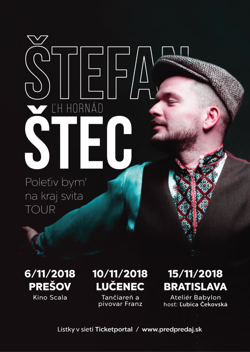„Rusínsky Karel Gott“ ide na svoje prvé turné! Štefan Štec, ktorý si vyslúžil túto prezývku, očaril publikum v šou „Zem spieva“ a odvtedy aj naďalej dokazuje, že je naozaj výnimočným umelcom. Rusínske ľudové piesne v jeho podaní sú doslova trhákom. Album „Poleťiv by'm na kraj svita“ pred pár mesiacmi pokrstila Ľubica Čekovská a stále sa drží na prvých priečkach v rebríčku predaja. Mladý hudobník ide na svoje prvé turné, kde nielenže zaspieva piesne z albumu, ale predstaví aj novinky. Ako hostí si zavolal Petra Biča s kapelou a Ľubicu Čekovskú. Turné Štefana Šteca bude nádherne temperamentné, nenechajte si ho ujsť!