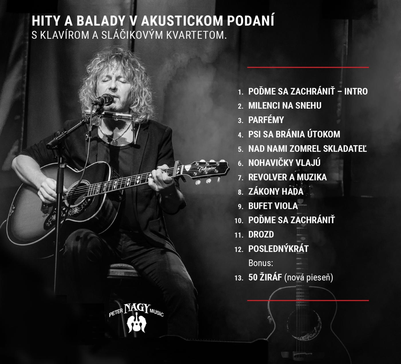 Česko-slovenská legenda Peter Nagy vydáva nový album! CD s názvom "PIANKO" obsahuje 13 piesní z repertoáru skladateľa, textára a hlavne speváka Petra Nagya v akustických aranžmánoch. Ide o "tichú" verziu Petrových hitov a balád, pričom celkový zvuk piesní je založený na zvuku klavíra a sláčikového kvarteta. Album si fanúšikovia môžu naživo vypočuť na Vianočnom PIANKO tour 2018, ktoré Peter Nagy štartuje 22. novembra v Skalici!