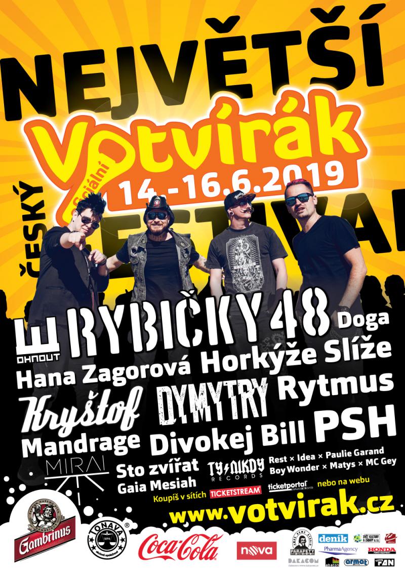 14. do 16. června 2019 tradičně na letišti Boží Dar ve středočeských Milovicích vystoupí vedle známých kapel, které pozvání na festival Votvírák 2019, nedostali od pořadatelů poprvé a jsou na letišti v Milovicích téměř jako doma, jako jsou KRYŠTOF, DIVOKEJ BILL, JAROSLAV UHLÍŘ, RYBIČKY 48, DYMYTRY, HORKÝŽE SLÍŽE, STO ZVÍŘAT, XINDL X, MANDRAGE, SKYLINE, KRUCIPUSK, VISACÍ ZÁMEK, WOHNOUT, VYPSANÁ FIXA, RYTMUS, PSH, DOGA a mnoha dalších se objeví úplně nová, ale o nic méně populární jména.