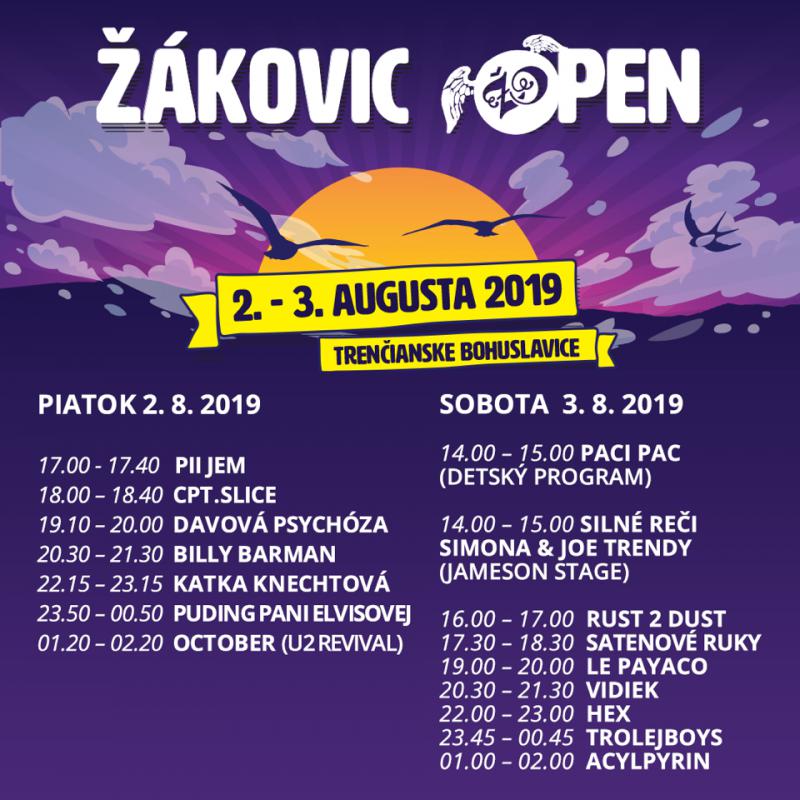 Obľúbený rodinný festival Žákovic Open v malebnom prostredí Bošáckej doliny je pripravený! Areál organizátori sprístupnia o 15-tej hodine a fanúšikom bude k dispozícii až do nedeľného dopoludnia. 19-ty ročník obľúbeného festivalu prináša niekoľko noviniek! Po prvýkrát sa na festivale predvedie stand up Silné reči a detský program PACI PAC! Pre návštevníkov je ako vždy pripravené parkovanie, stanová dedinka aj kyvadlová doprava zadarmo. Príďte si užiť magickú atmosféru festivalu Žákovic Open, ktorý je známy priateľskou a rodinnou pohodou. Chillout zóna festivalu sa v noci mení na párty, kde budú mixovať DJ-i!