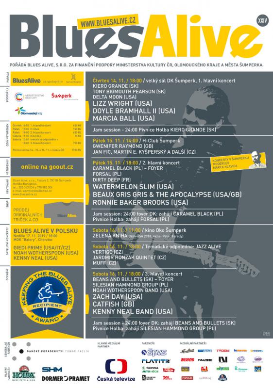 Od čtvrtka tři dny a tři noci bude žít severomoravský Šumperk bluesovou hudbou. Již dvacátý čtvrtý ročník mezinárodního festivalu Blues Alive nabídne světové hvězdy nejen tohoto žánru, přední domácí jména, mladé naděje, filmové projekce i noční jam-sessiony. Ze zahraničních jmen vystoupí například letošní držitel nejprestižnější ceny bluesového světa Blues Music Award v kategorii současného blues, louisianský multiinstrumentalista a zpěvák Kenny Neal, nejlepší současná pianistka podle týchž cen Marcia Ball, jeden z nejvýznamnějších představitelů střední generace chicagského blues Ronnie Baker Brooks či mimořádně úspěšná gospel-bluesová zpěvačka Lizz Wright.