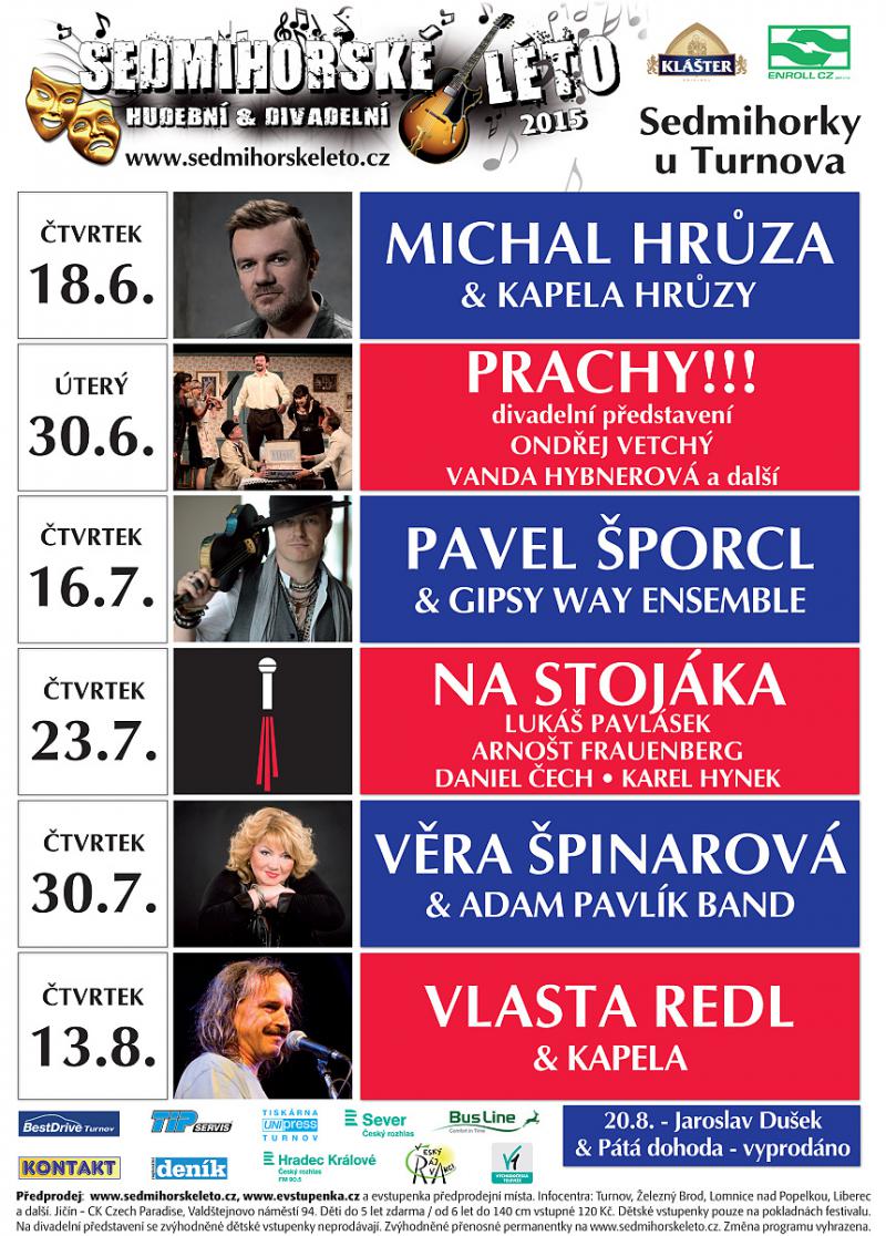 První akcí byl úspěšný koncert Michala Hrůzy & Kapely Hrůzy, kteří si večer s publikem skvěle užili. O rozproudění diváků se ještě před nástupem samotného Michala Hrůzy postarala mladá a nadějná kapela Mother´s Angels. Sedmihorské léto pokračuje hned v úterý 30. června, tentokráte divadlem. Na podiu v Sedmihorkách u Turnova se představí velké herecké hvězdy. Ondřej Vetchý, Vanda Hybnerová, Richard Trsťan, Michal Novotný, Nela Boudová, Pavel Kikinčuk, Jiří Štrébl a Zdeněk Košata.
