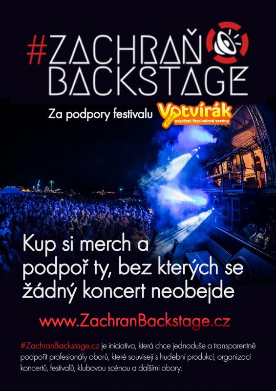 #zachranbackstage je iniciativa, jež chce jednoduše a transparentně podpořit profesionály oborů, které souvisejí s hudební produkcí, organizací koncertů, festivalů, klubovou scénou a dalšími obory. Subjekty, jež jsou zasaženy opatřeními směřujícími k zabránění šíření viru známého jako covid-19. Chceme prostřednictvím prodeje merchandise, případně dalších produktů a služeb, vybrat co nejvíce finančních prostředků, které nasměrujeme k postiženým profesionálům hudebního průmyslu. Jasně, co nejjednodušeji a s podmínkou transparentnosti všech zúčastněných stran. Hlavním iniciátorem jsou festival Votvírák, FANonline a vansforbands.cz.