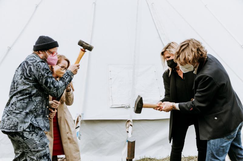 Návrat ke kořenům a slovo rituál zmiňuje i výtvarník Lukáš Musil. „Já to beru jako indiánský stan. Hlavně kvůli rituálu, který s tou představou souvisí. Sám pro sebe jsem si to takhle interpretoval. A také jsem u malby přemýšlel nad tím, co máme spojené ještě se starším tématem jeskyně, jaký má jeskyně význam dneska. V neposlední řadě jsem si položil otázku, co pro nás znamená slavení a oslava,“ uvedl umělec, který stanovou plachtu zvenku pomaloval svými symboly, a esteticky tak šapitó povýšil na rozměrné umělecké dílo.