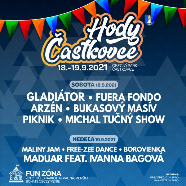 Už tento víkend vypukne festival Hody Častkovce! 17. až 19. augusta 2021 zahrajú v obecnom parku Častkovce kapely Gladiator, Arzén, Zoči Voči, Heľenine oči, King Shaolin, Fuera Fondo alebo Bukasov masív. O dobrú zábavu sa postarajú skupiny Piknik - Michal Tučný show či Maduar feat. Ivanna Bagová. Malí aj veľkí sa zabavia vo funzóne a tí hladní majú možnosť navštíviť skvelú gastrozónu. Festivalu štartuje v piatok 17. septembra o 15:00!
