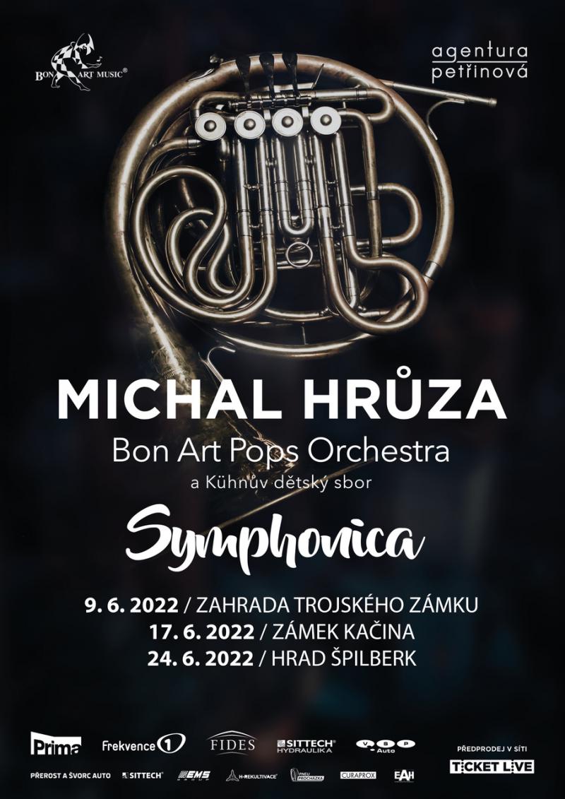 Michal Hrůza v rámci turné Symphonica zahraje na třech nádherných místech s osobitým geniem loci: 9. června v zahradě Trojského zámku v Praze, 17. června na Zámku Kačina a 24. června na brněnském hradě Špilberk. Oblíbeného hitmakera doprovodí kapela Hrůzy, ženský symfonický orchestr Bon Art Pops Orchestra a proslulý Kühnův dětský sbor. Mimořádný hudební zážitek umocní výborná gastronomie a speciální doprovodný program s možností prohlídek okolí a případně vnitřních prostor jednotlivých lokací.