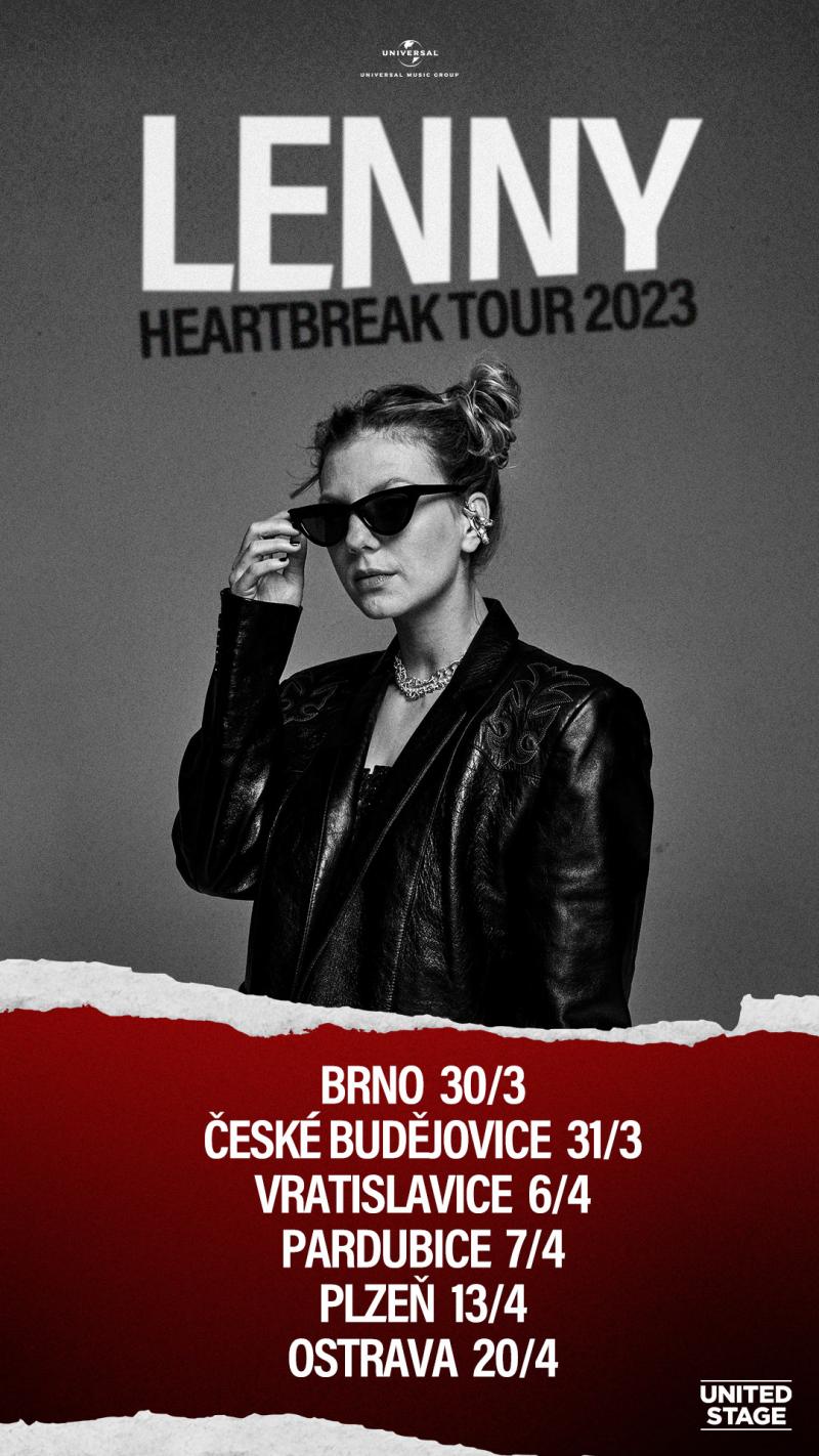 Jeden z nejcharismatičtějších hlasů na české popové scéně, zpěvačka Lenny, rozezpívala na konci listopadu pražskou halu O2 Universum na svém dosud největším koncertě. Předvedla našlapanou hudební i vizuální show a se skvělými hosty udělala radost fanouškům, kteří na dvakrát odkládaný koncert čekali. Nyní se oblíbená zpěvačka vrací z velkých halových pódií do intimnějších rockových klubů. Už příští rok v březnu a dubnu přiveze svou show v rámci Heartbreak Tour do Brna, Českých Budějovic, Vratislavic, Pardubic, Plzně a Ostravy.