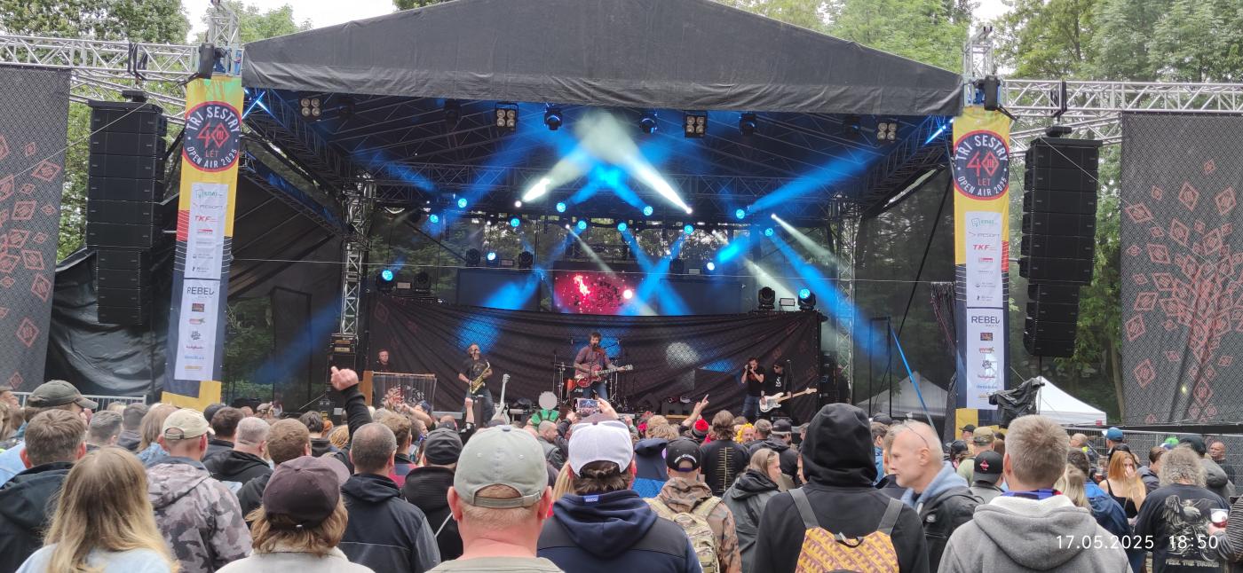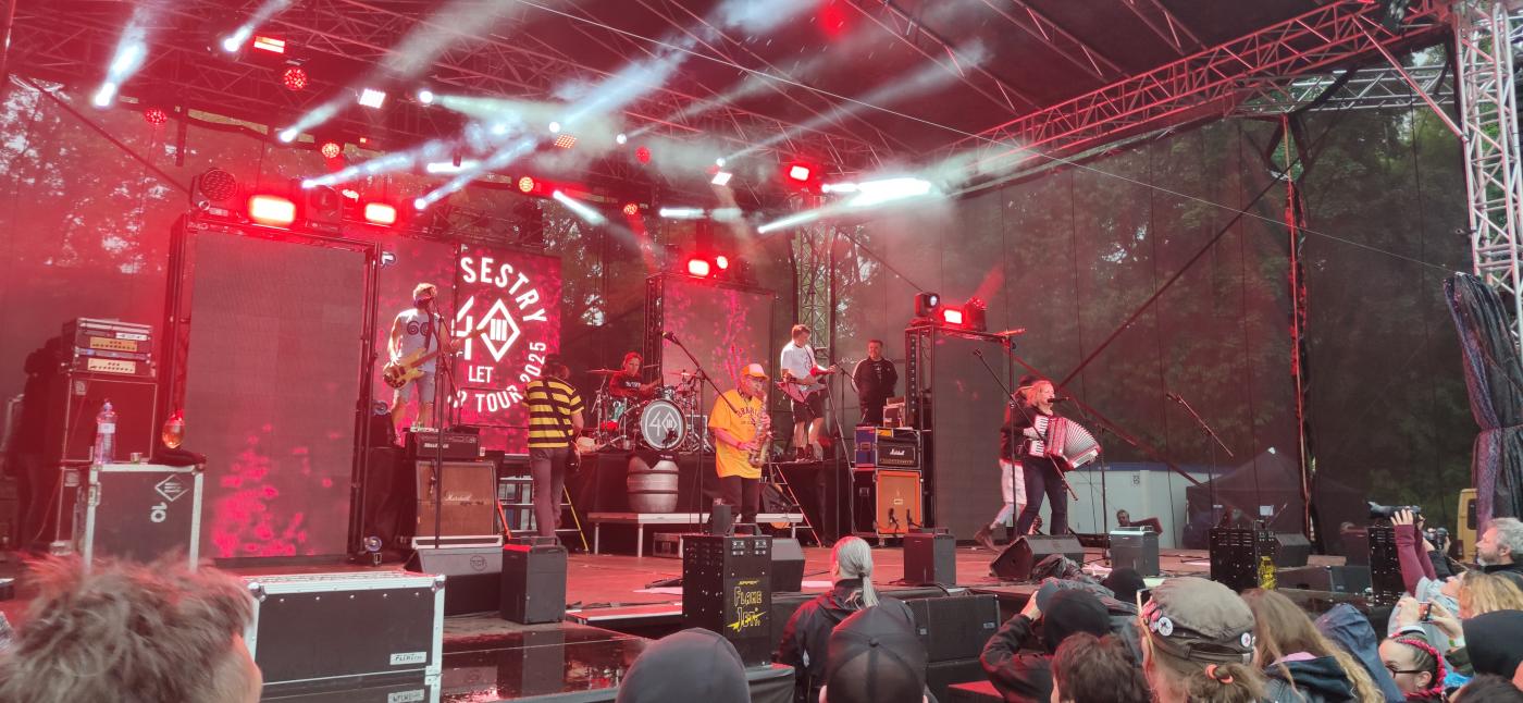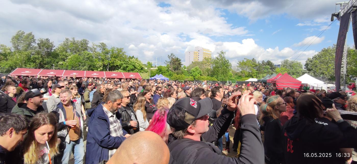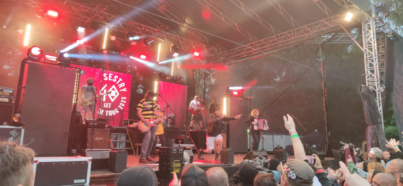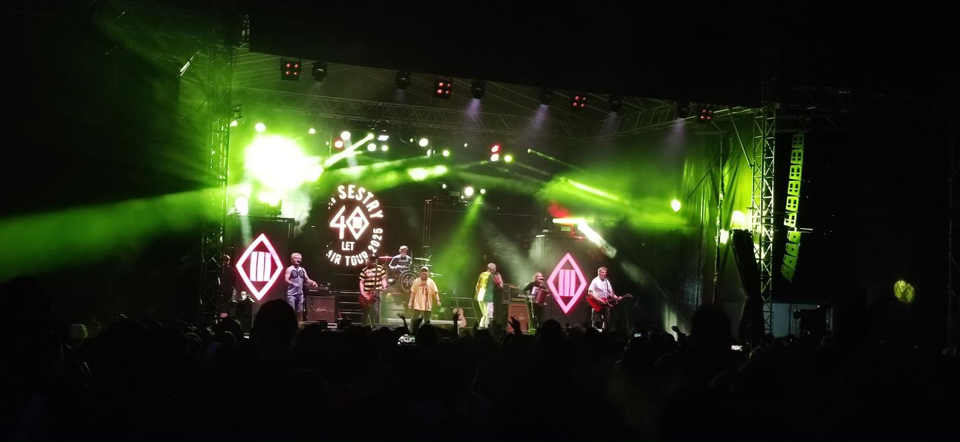 Déšť se stal nečekaným, ale vítaným společníkem večera. Místo toho, aby fanoušky zahnal, jen posílil atmosféru – zpívalo se, tančilo a pilo pivo Tři sestry, které bylo dostupné v červenočerných stáncích po celém areálu. Lidé si večírek užívali naplno, mokří, ale šťastní, v rytmu hudby a v duchu oslavy jedné z nejzásadnějších kapel české scény.